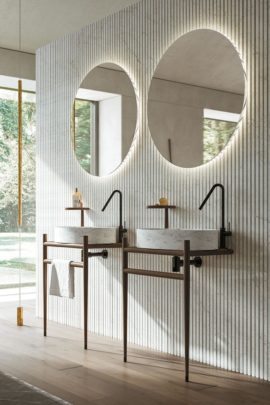 La base est composée d’un module lavabo avec ouverture push-pull et d’un modu- le de rangement adjacent, à plus grande capacité, doté d’une ouverture avec Gola 1 et d’un bandeau Gola en Tono Magnolia, coordonné à la bordure. Équipée d’un tiroir et d’une barre porte-serviettes laquée assortie à la bordure.